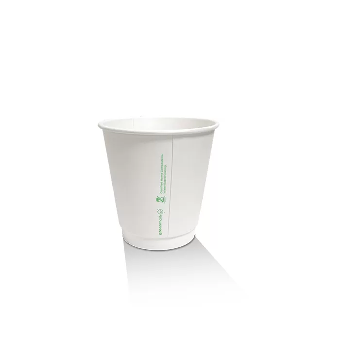 Double-wall cup, made from white paper with aqueous coating on the interior.Our cups are coated with a food-grade aqueous coating, which is both safe for consumption and gentle on the planet.
